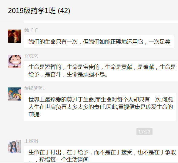以“珍爱生命”为主题,以微信群聊的形式让学生们讨论生命的重要意义,以及理解生命对一个人的重要性。