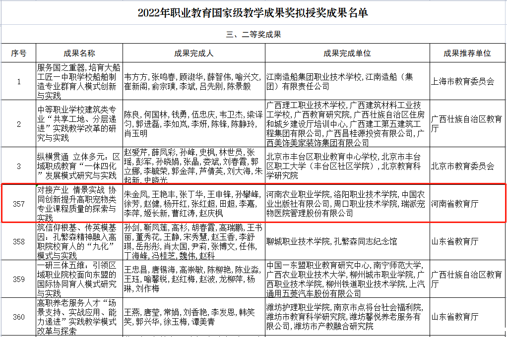 近日,教育部公示了2022年职业教育国家级教学成果奖拟授奖成果,我院教师朱金凤教授主持的项目《对接产业 情景实战 协同创新提升高职宠物类专业课程质量的探索与实践》、董均副教授参与的项目《“产、学、研、转、创、用”葡萄酒技能人才育人模式创新与实践》荣获国家级教学成果二等奖,实现了学院在国家级教学成果奖评选中的新突破。